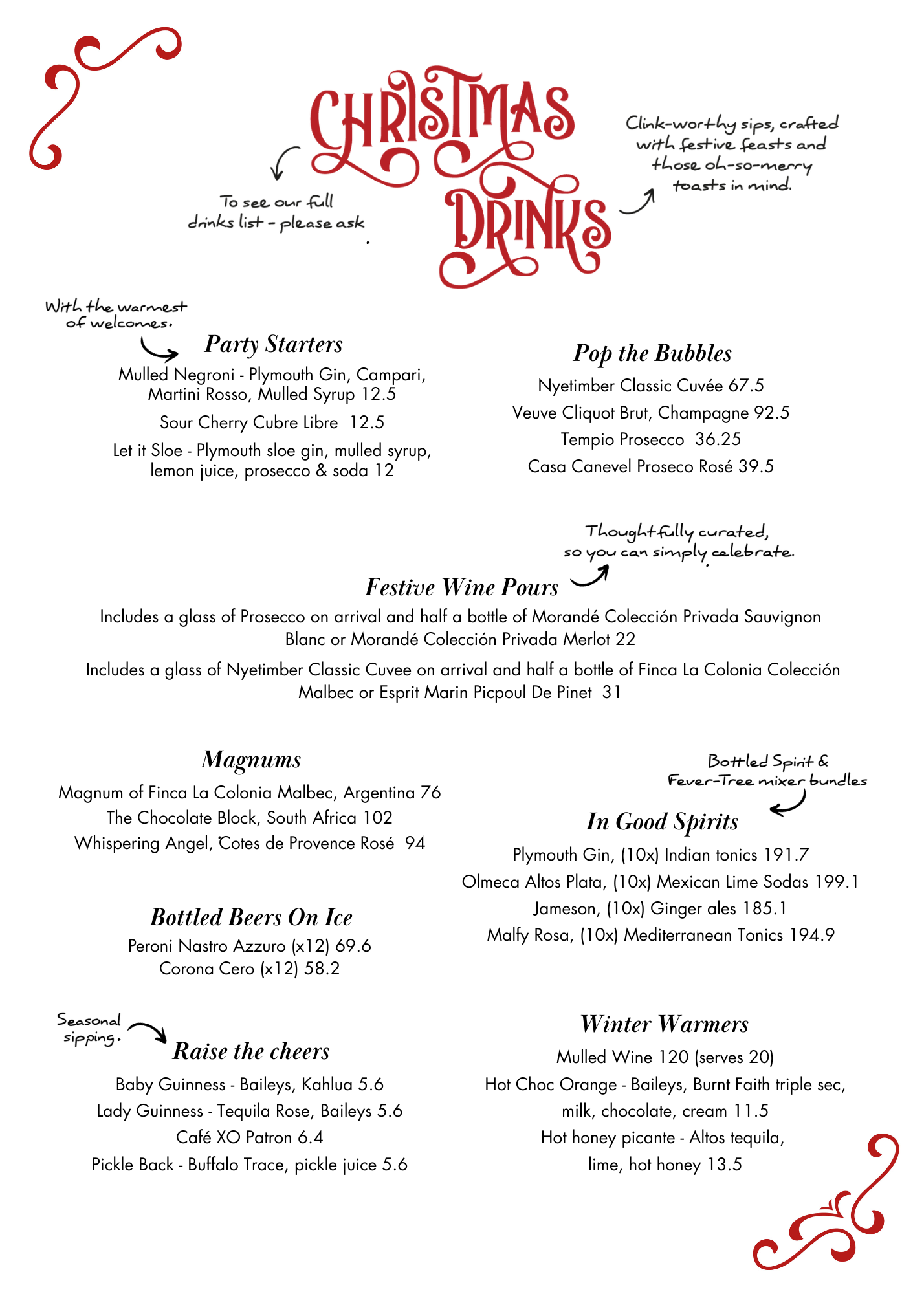 Want to kick off your Christmas party with a bang? From perfectly chilled, bubble-bursting Prosecco to celebration-worthy Champagne, or any vibrant, sparkle-packed fizz of your choice, we’ll have the wine waiting, ready and waiting to pour as soon as you step through the door (because who wants to waste a single festive second queueing at the bar?).